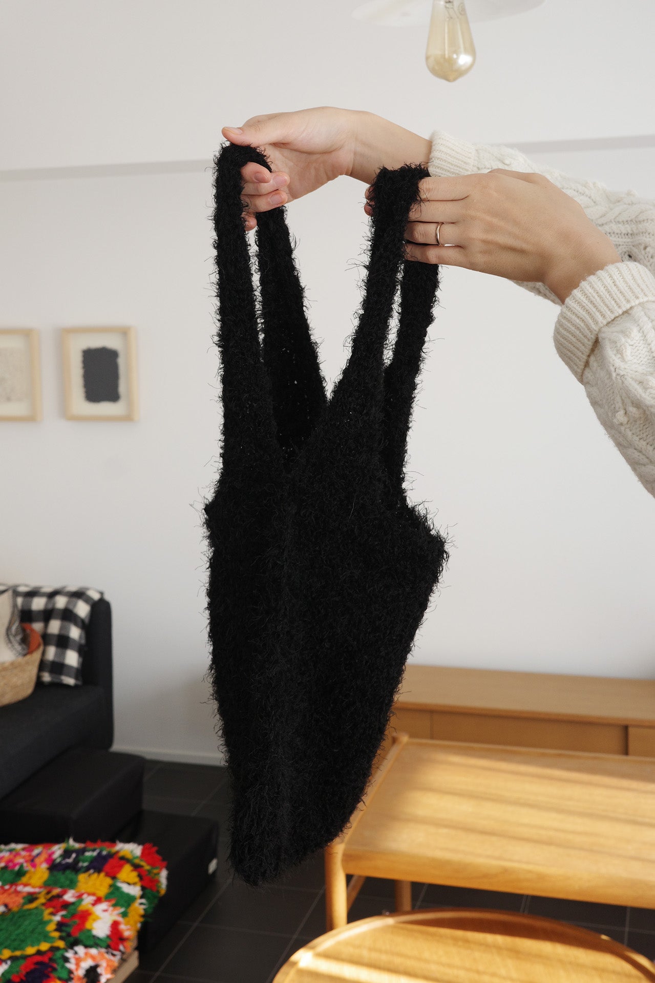 さまざまな長さの毛をミックスしたフェイクファーヤーンを使用しています。ふんわりとした厚みとリッチな存在感のあるニットバッグ。 柔らかな手触りと、モケモケとした表情が魅力です。