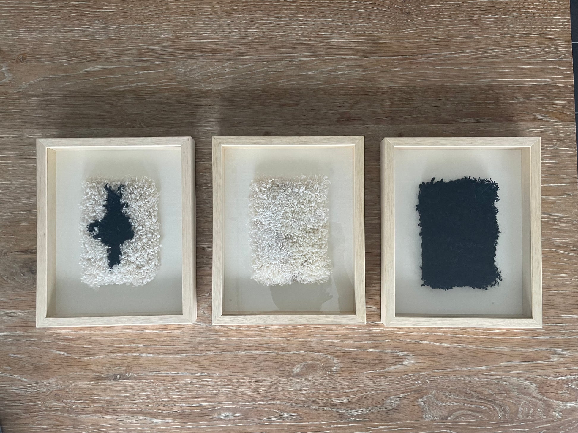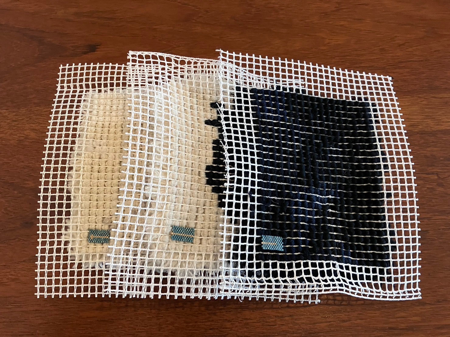 タッピを使用した作品は 色とりどりの毛糸をミックスして作られていて、100cm四方ほどの大きなラグになると何か月もかかると話していました。マユコさんの毛糸を使用した作品を額装したものを見せていただいた時に、わたしの中でパズルのピースがカチッとはまる感覚がありました。