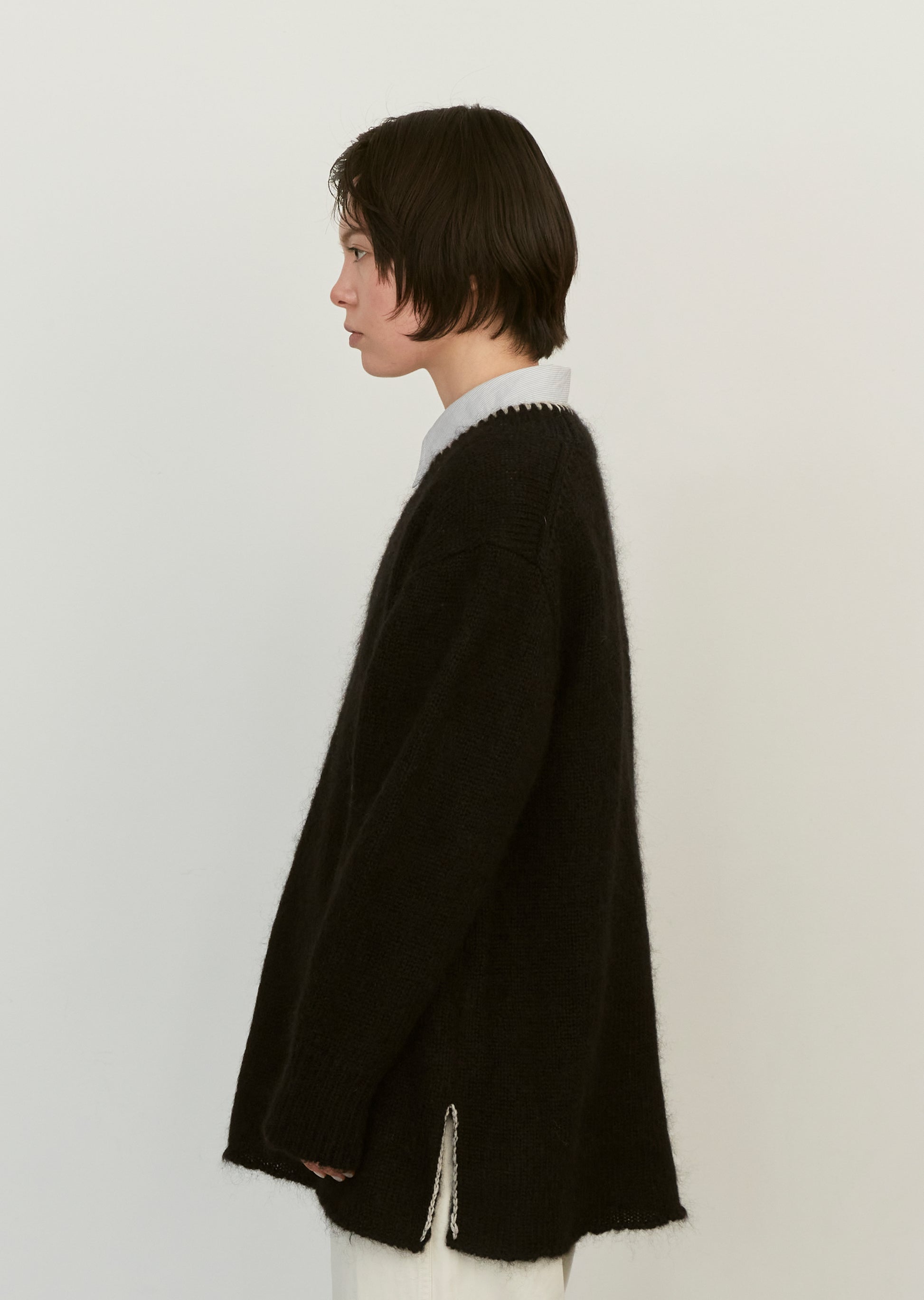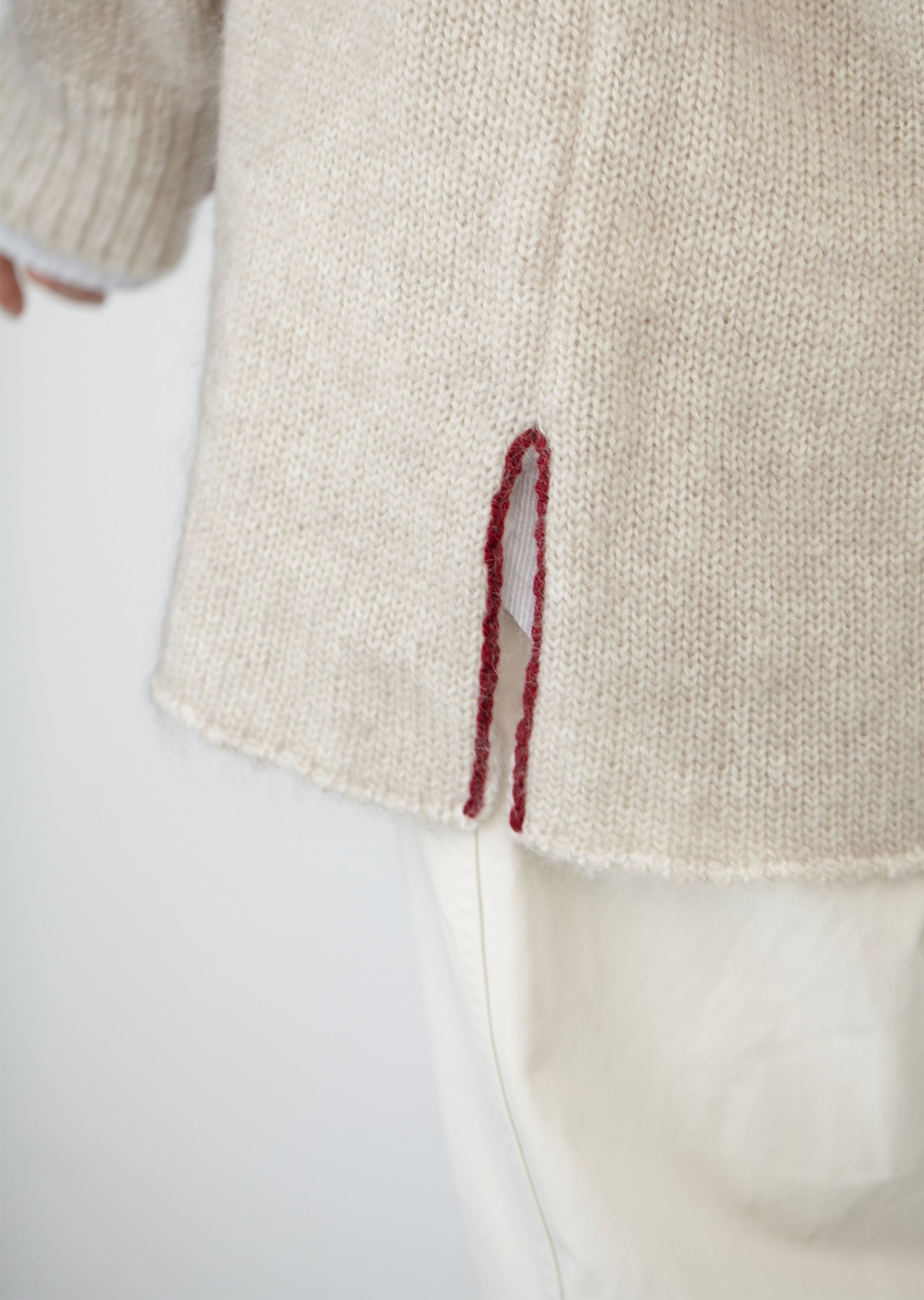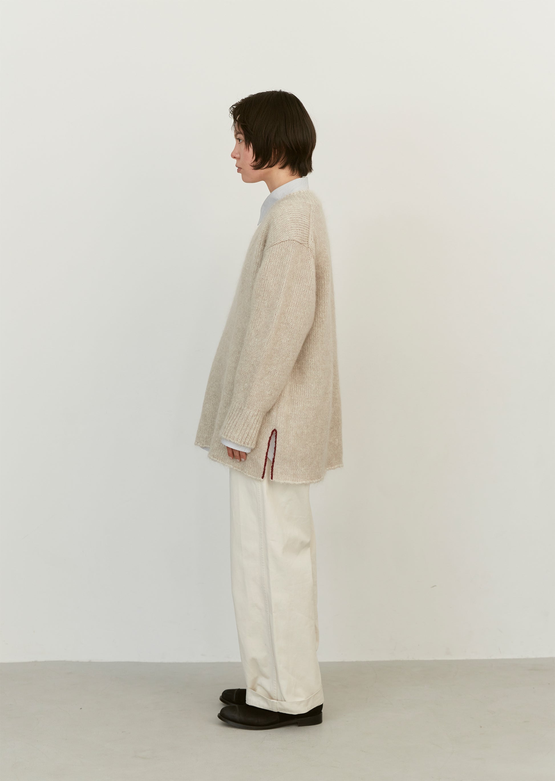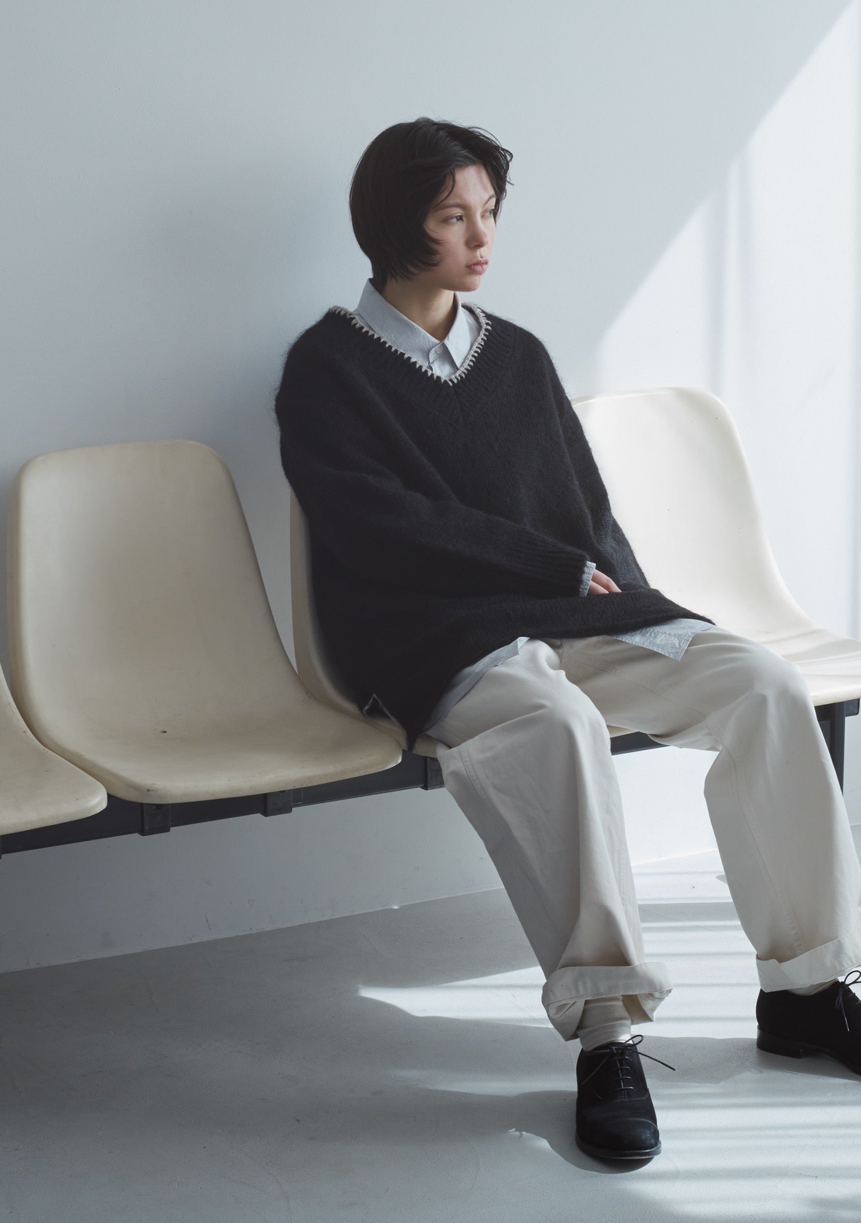 太い衿リブの周りに、ブランケットステッチを刺したVネックのプルオーバーです。ブランケットステッチは、一点一点手で刺しています。着丈が長く、袖口もゆったりとしている一枚。両サイド裾のスリットにはチェーンステッチを刺しています。