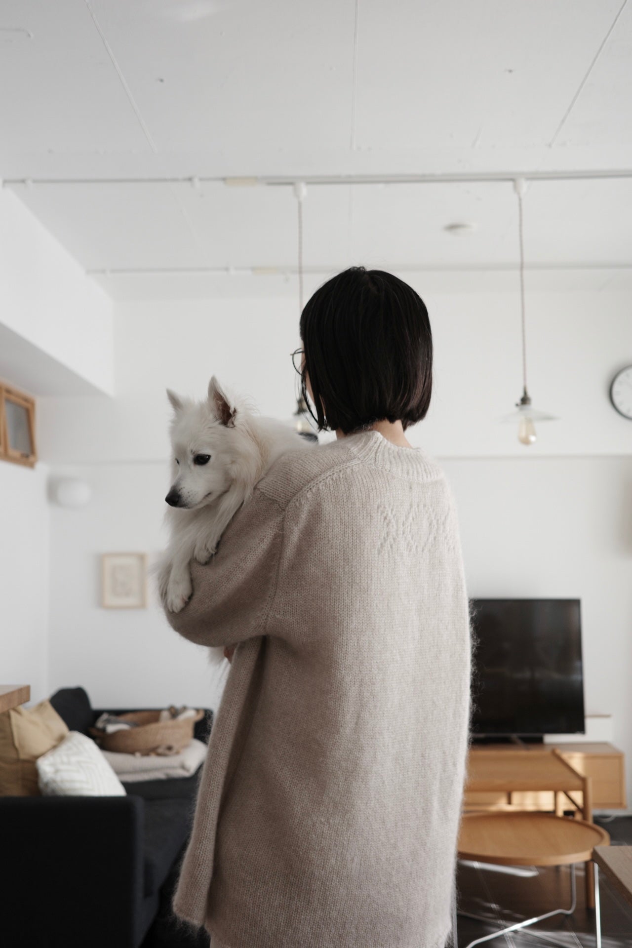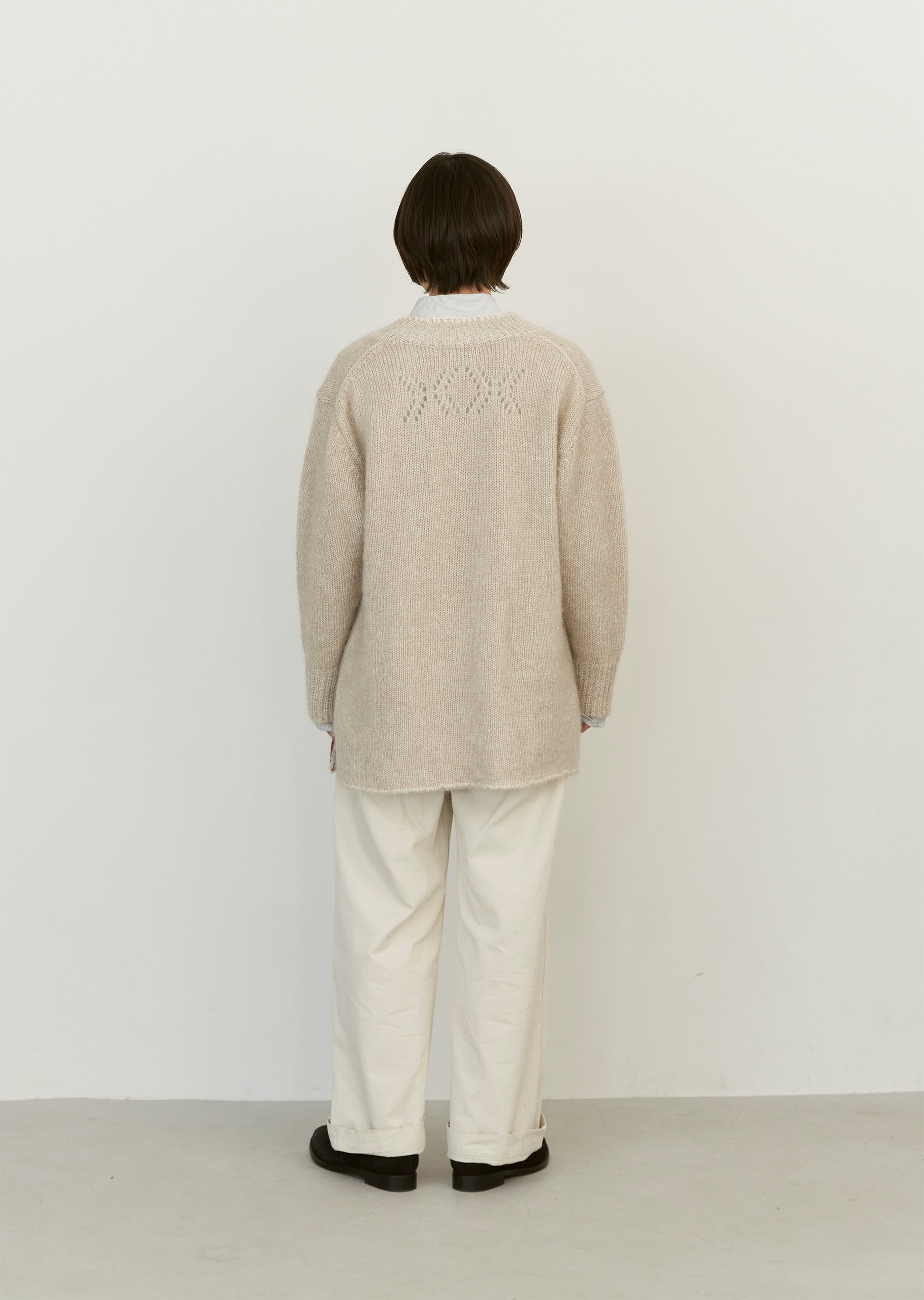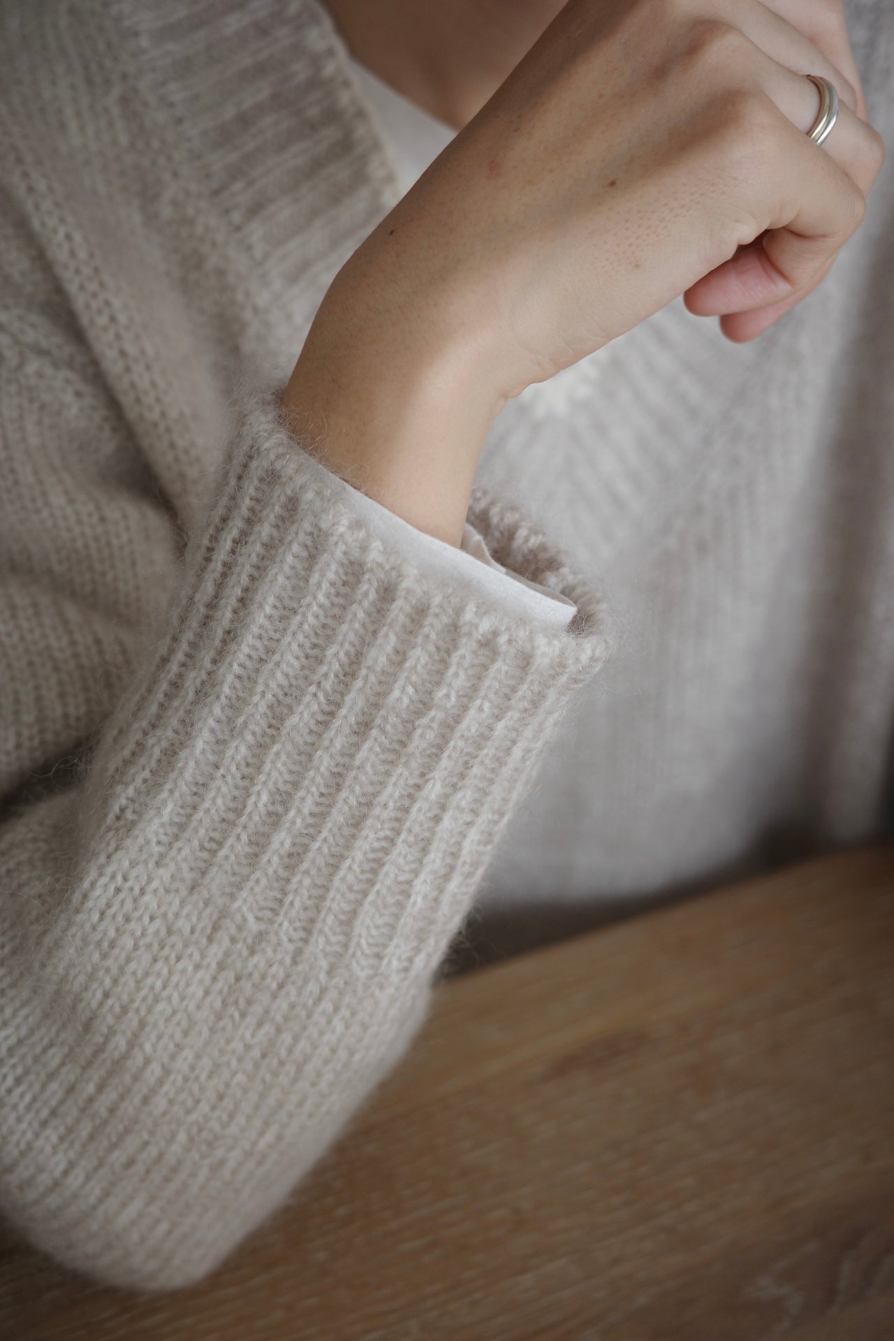 シルクとモヘアを撚糸した糸とウール糸を使用した、シャギーな膨らみの中に光沢のあるシルク糸がチラつく、独特な表情感のある素材に仕上げました。